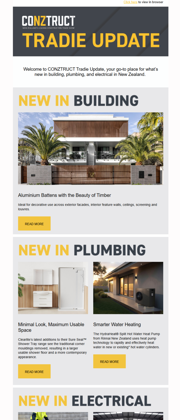 - CONZTRUCT Tradie Update reaches 25,000+ builders, plumbers, electricians, and tradies every quarter.